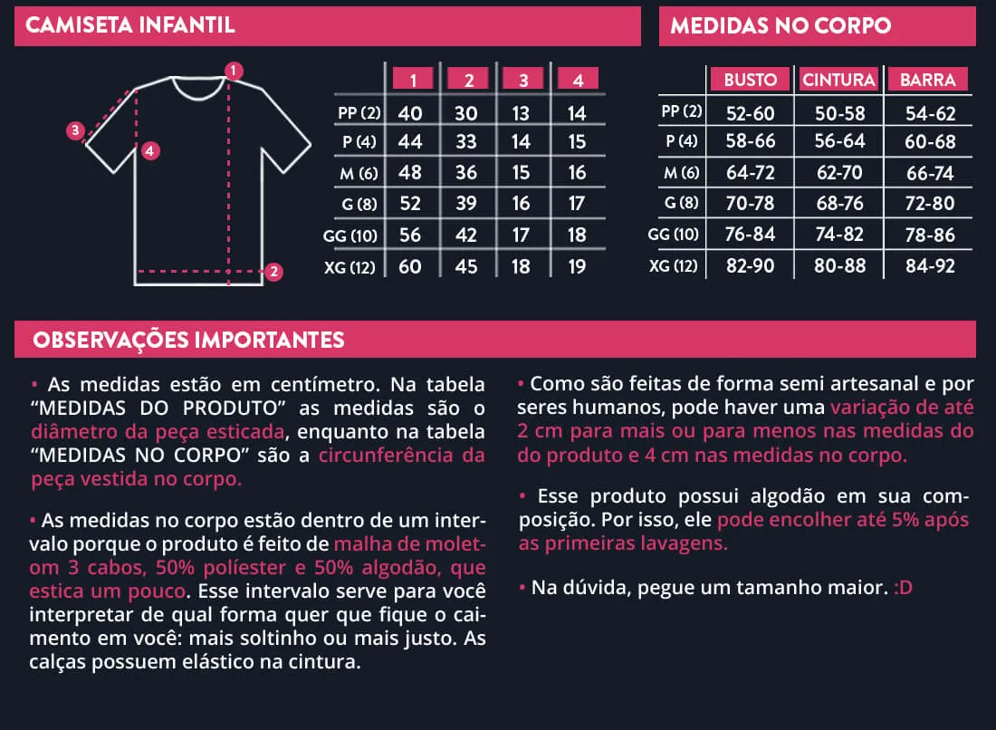 Composição: Malha 100% algodão fio 30.1, gramatura 160g